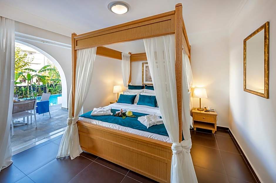 Offering access to a communal swimming pool, this suite has a balcony with pool views and a four-poster bed.